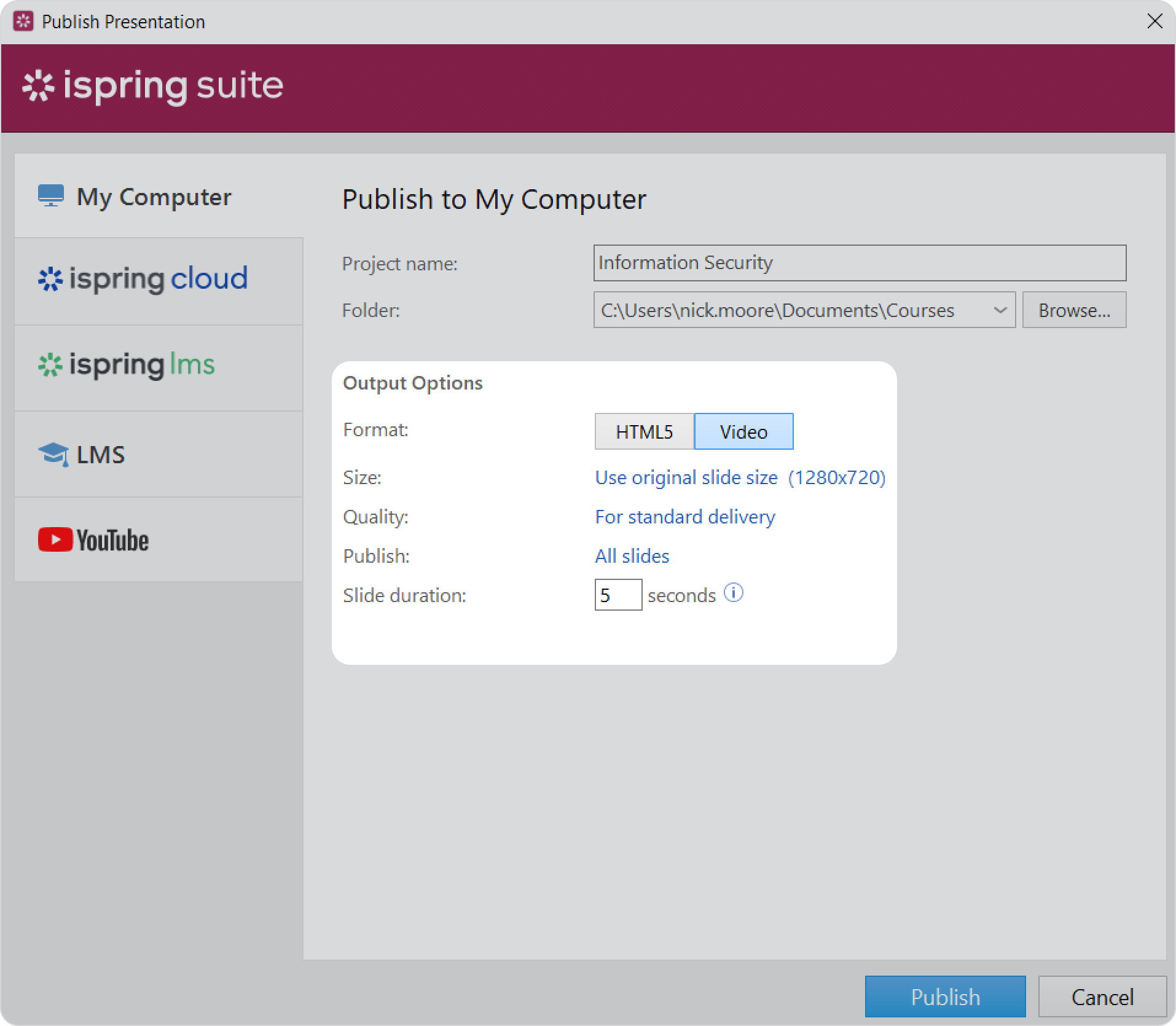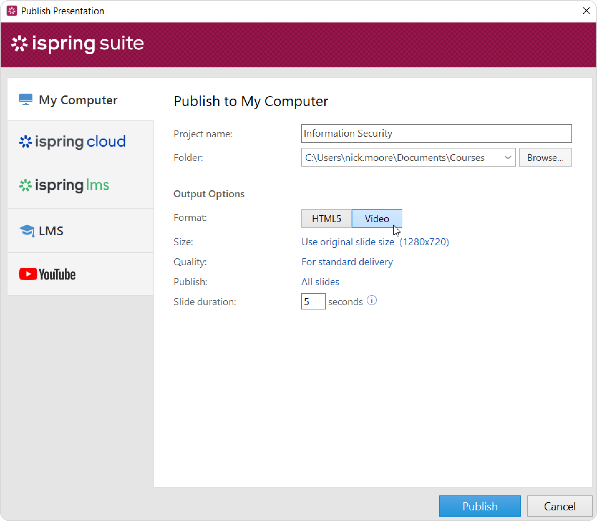 - In the Publish Presentation window, click My Computer. Enter the title of the video in the Project name field. By default, the name is the same as the title of the PowerPoint presentation.
