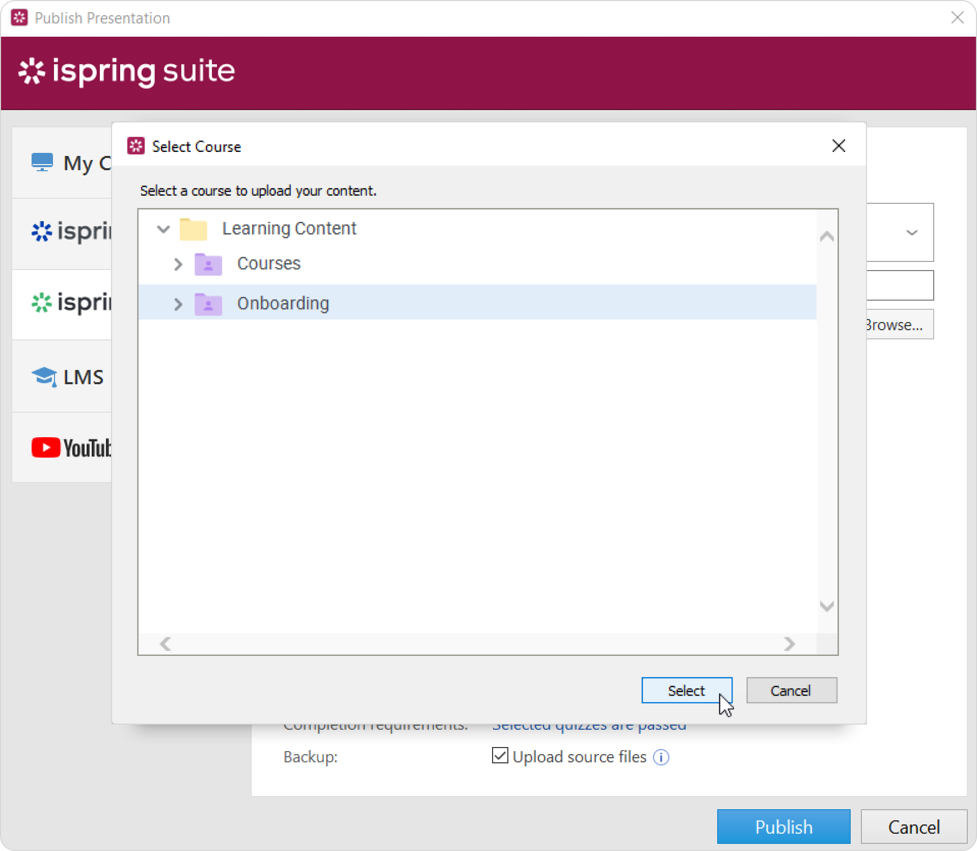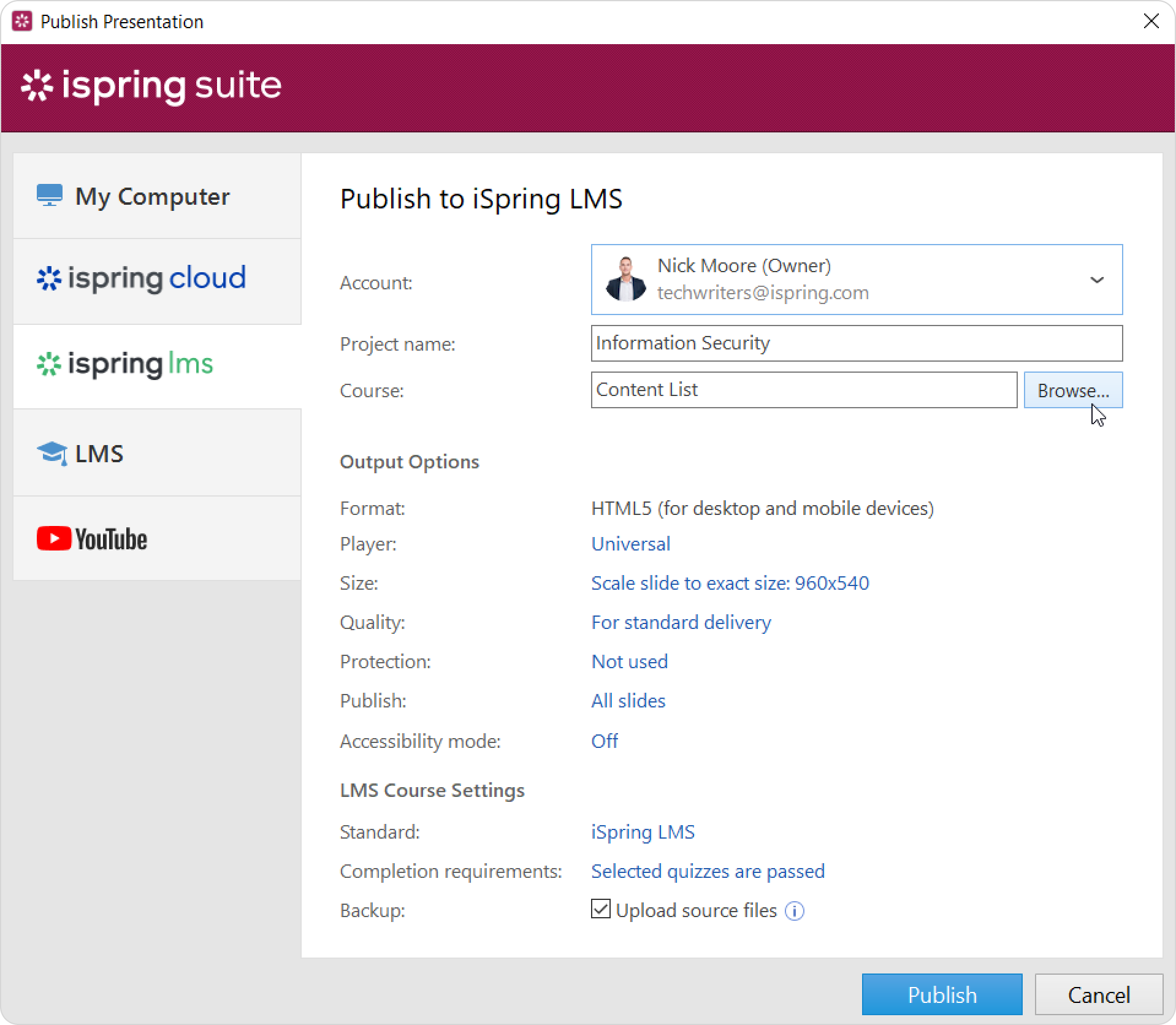 - In the Publish Presentation window, select the iSpring LMS tab. Select the project that has the content you want to replace. To do this, click Browse in the Course field.