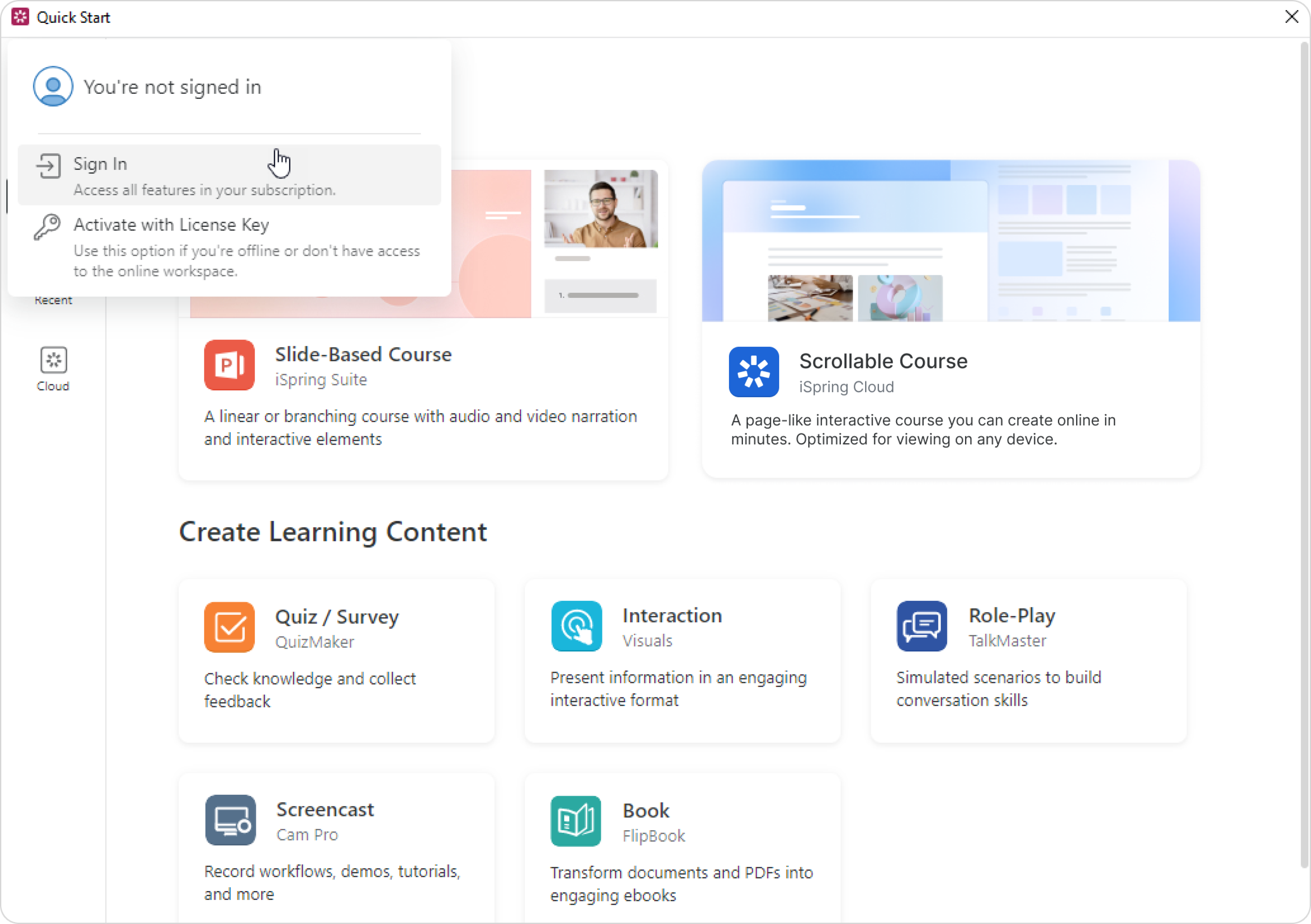 iSpring Suite 11 Signing in to iSpring Suite Current: Signing in to Your iSpring Suite Using Your Google Account Signing in to Your iSpring Suite Using Your Google Account Open iSpring Suite AI and click on Sign In.Next, select Continue with Google.Then, you will be asked to log in with your Google account; click on Connect.Enter your Google account password to confirm, and click Continue.That's it! You’ve signed in to iSpring Suite using your Google account. ×