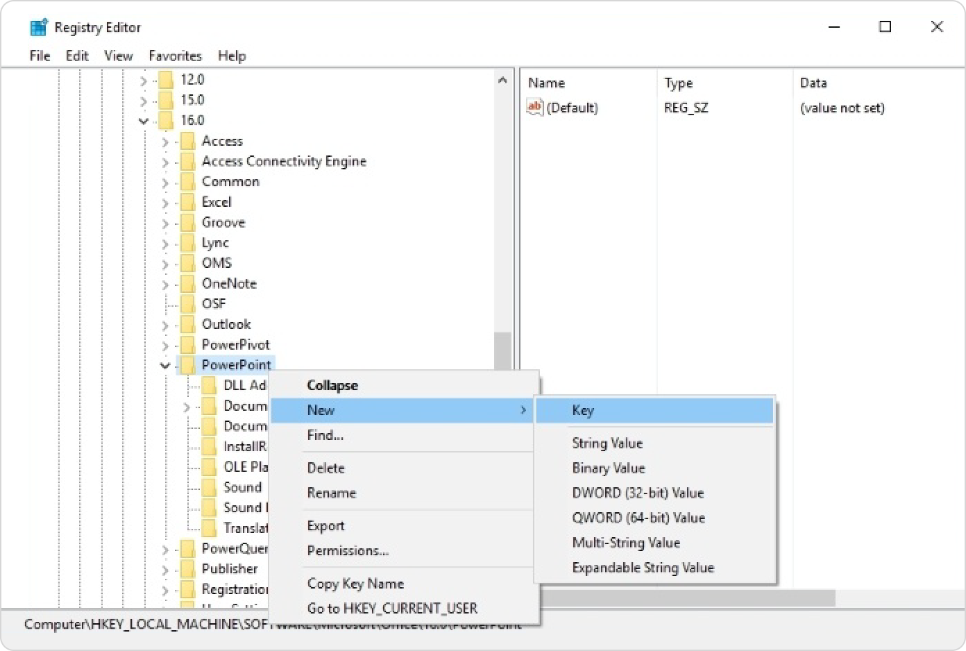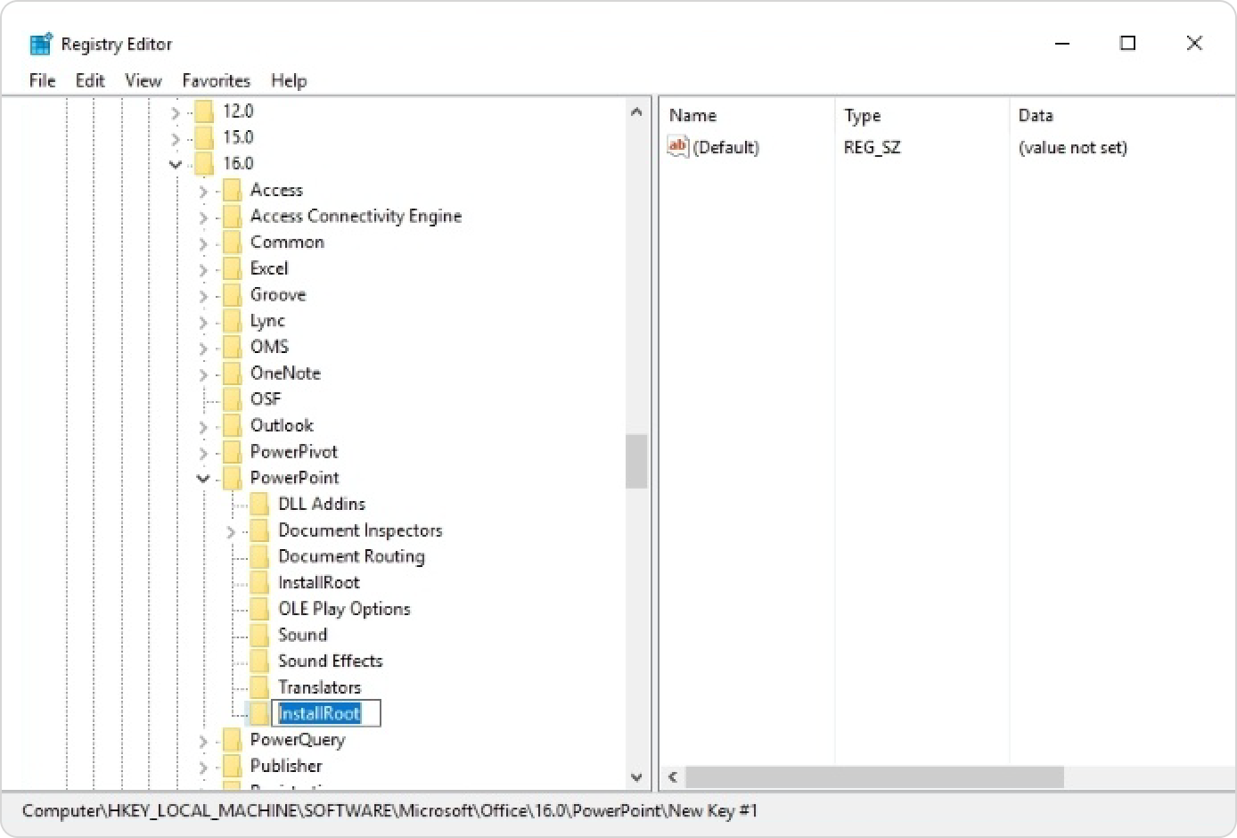 If you can’t go further than \Microsoft\Office\16.0\PowerPoint\, then you need to manually create an InstallRoot key. If you have the InstallRoot key, go to Step 7.