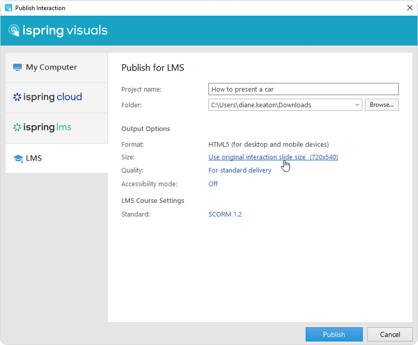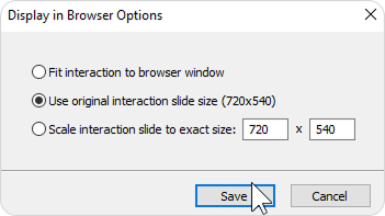 By default, the slide size of a published interaction is the one that is specified in the interaction properties. But, if you wish, you can select how an interaction displays in a browser after publishing.