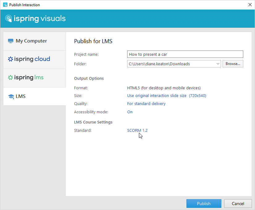 When publishing for an LMS, you can select the parameters of the output package that include information about the published interaction.
