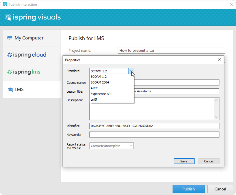 iSpring Visuals Publishing Interactions Current: Publishing Options Publishing Options Change interaction publishing settings in the Output Options section.SizeQualityAccessibilityIf you are publishing an interaction to an LMS, you will be able to choose an LMS profile and customize it. Learn how to do that in the LMS Profile Settings article. ×