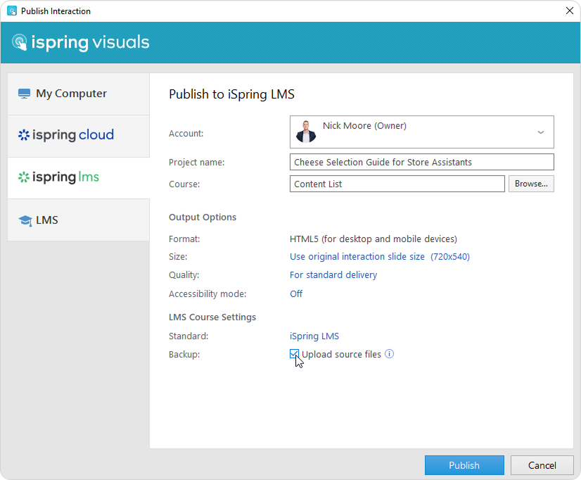 • In the Backup field, select Upload source files so that you and your administrators will be able to download the source files of the interaction in iSpring LMS.