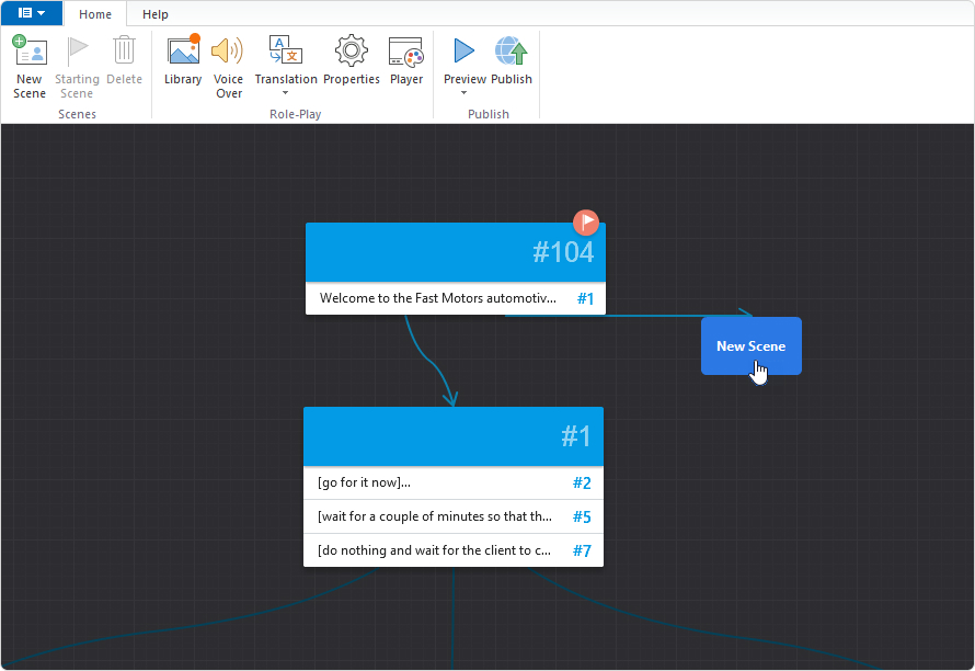 Afterwards, you can drag the link icon from the second reply and create a corresponding scene. Add text info similar to to the first scene. You do not need to select character and background for the second and further scenes since they will be taken over from the first scene.