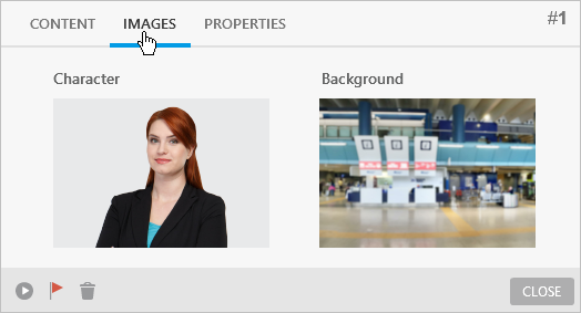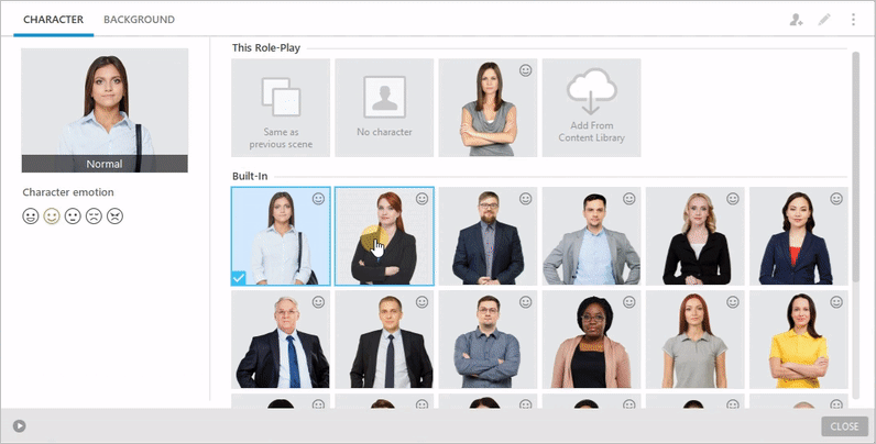 The character gallery will open up. Choose a character to appear in this scene, and then go to the Background tab to choose a background from the background gallery. When you’re done picking your character and background, click Close.