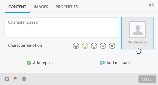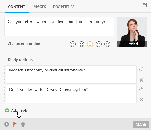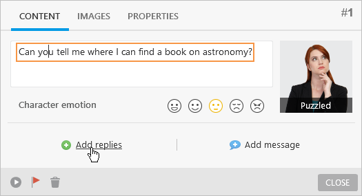 Back on the Content tab, enter some text for the character to say, and then click Add replies to give the user some choices as to how to respond to the character.