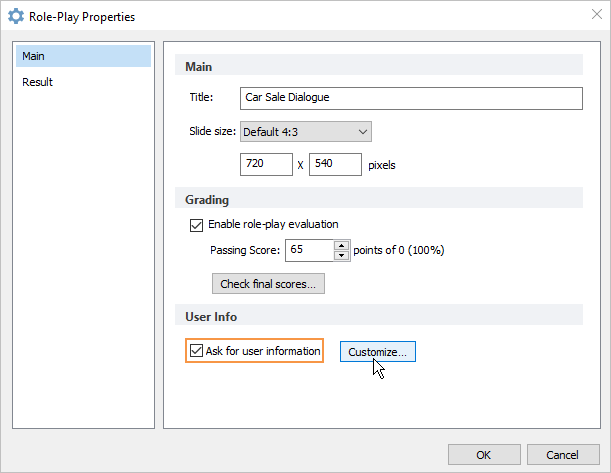 - Enable the user information request form in the Role-Play Properties window and click Customize.