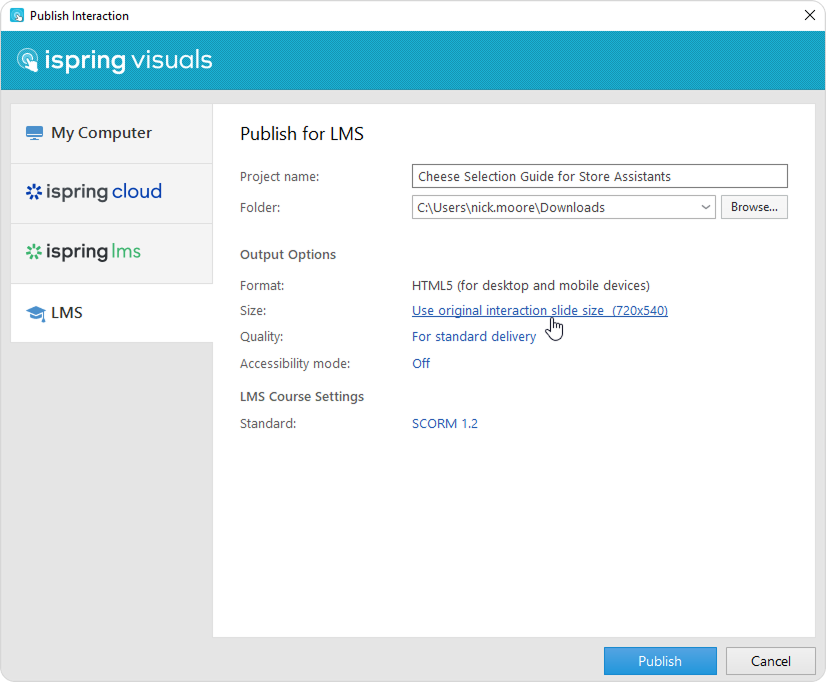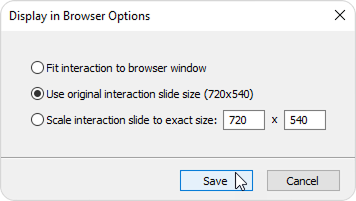 By default, the slide size of a published interaction is the one that is specified in the interaction properties. But, if you wish, you can select how an interaction displays in a browser after publishing.