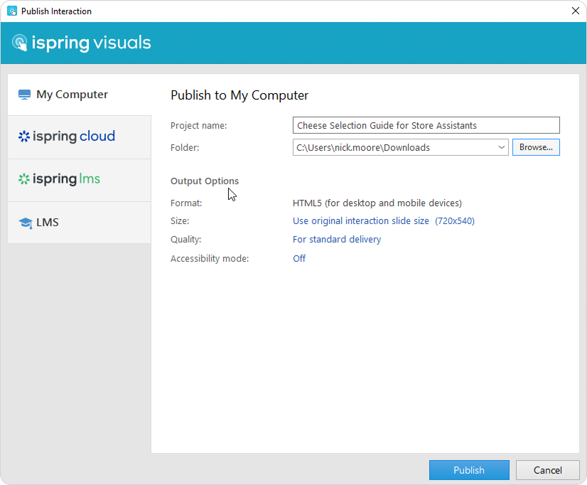 iSpring Visuals Publishing Interactions Current: Publishing Options Publishing Options Change interaction publishing settings in the Output Options section.SizeQualityAccessibilityIf you are publishing an interaction to an LMS, you will be able to choose an LMS profile and customize it. Learn how to do that in the LMS Profile Settings article. ×
