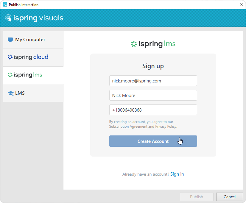 - Create a new free iSpring Learn account right in the publishing window. Enter your email, name, and phone number, and click Create Account. You will receive an email with your login details.