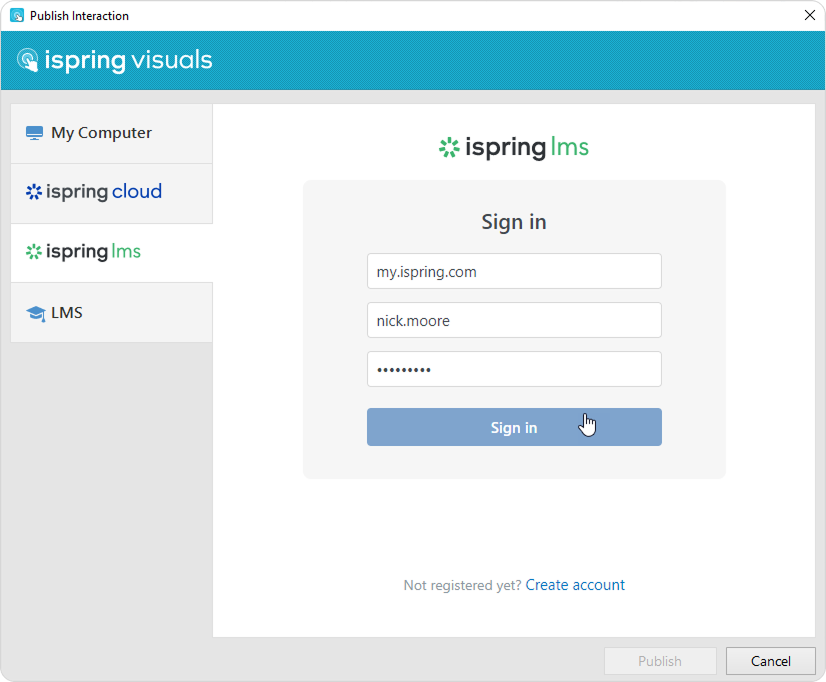- If you are already registered, click the Sign in link at the bottom of the window and enter your email and password for your iSpring Learn account. Then click Sign In. The specified data will be saved in iSpring Visuals, and you do not have to enter it every time.