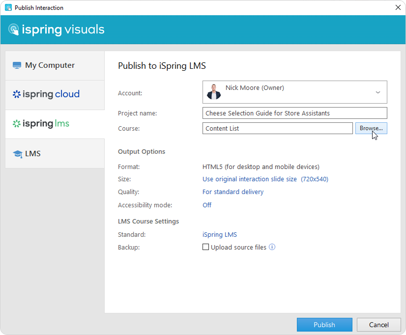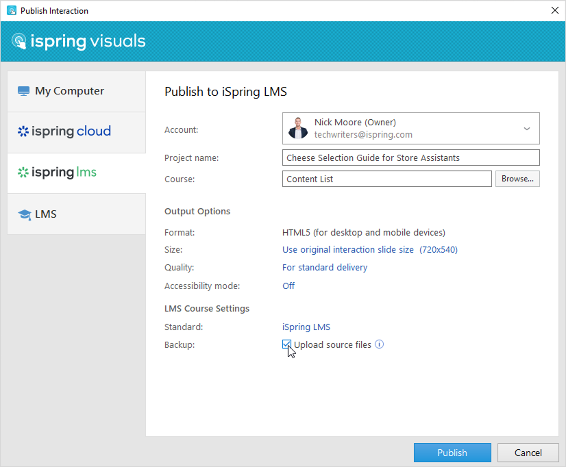 - In the Backup field, select Upload source files so that you and your administrators will be able to download the source files of the interaction in iSpring LMS.