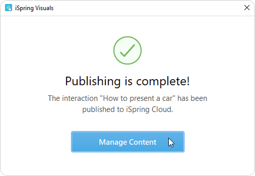 When the publishing process is successfully completed, a new window will open. To open the published interaction in the iSpring Learn interface, click Manage Content.