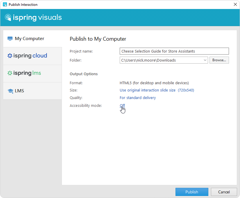 After the interaction is published, you will get in a special format. It will have two view modes: standard and available for visually impaired people. Learners will switch the modes by clicking on an icon.