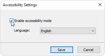 - Check Enable accessibility mode and choose a language. A screen reader pronounces text in the language you set, and if it doesn’t match the actual language of your interaction, the screen reader will voice it over with a strange accent.