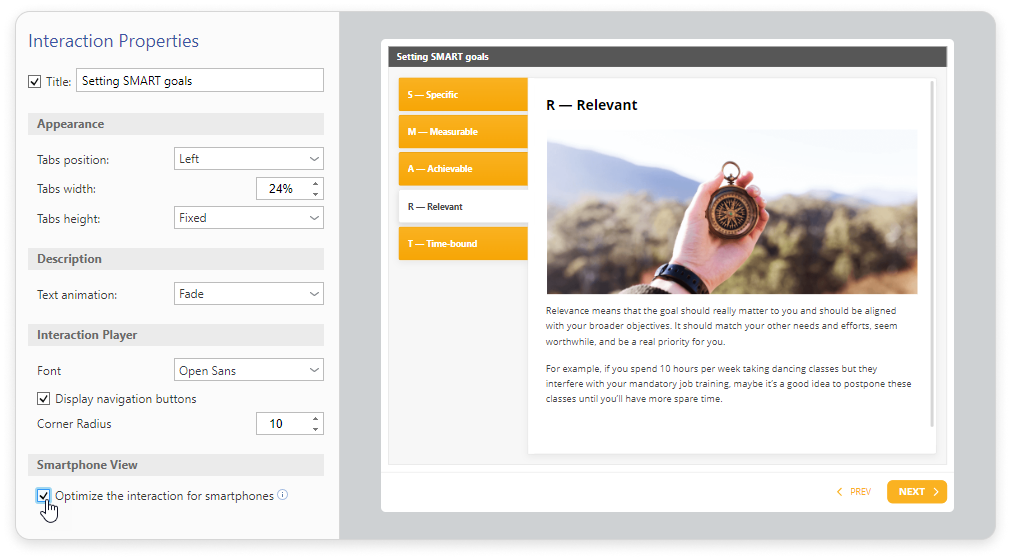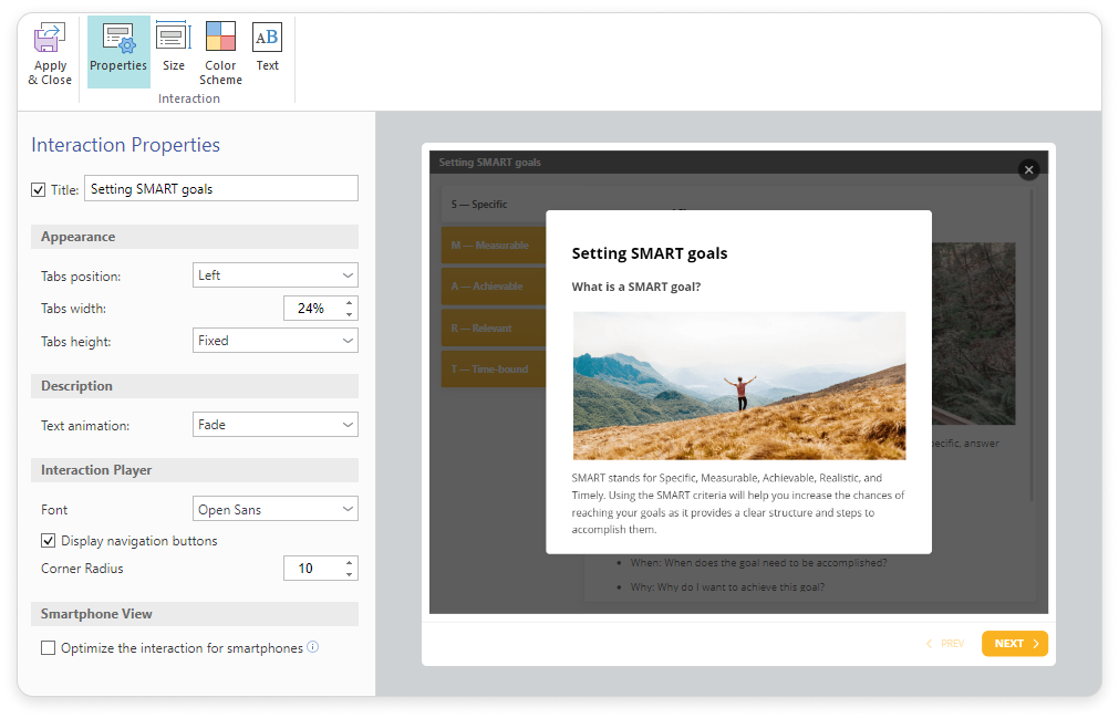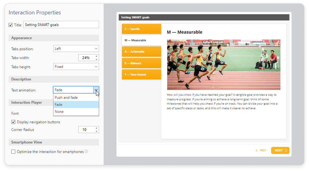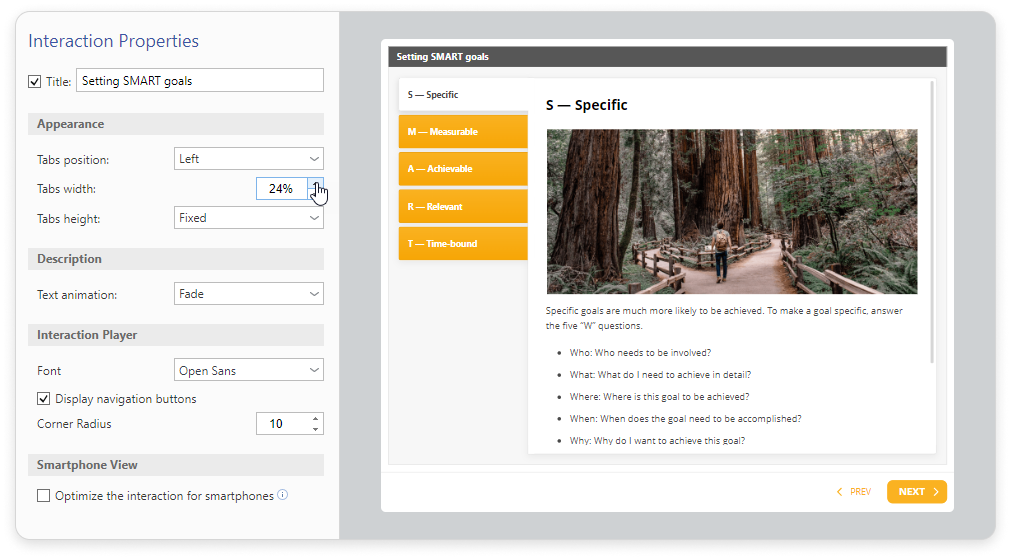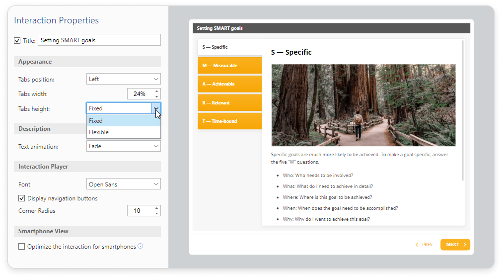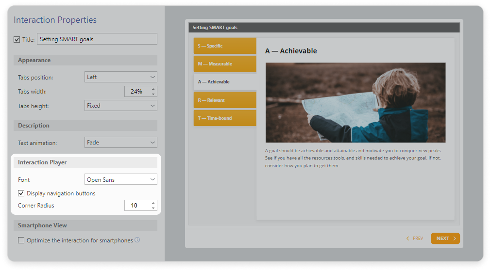 Set up the interaction player. Select the font and the corner radius for the buttons. You can also enable or disable navigation buttons display by checking the box.