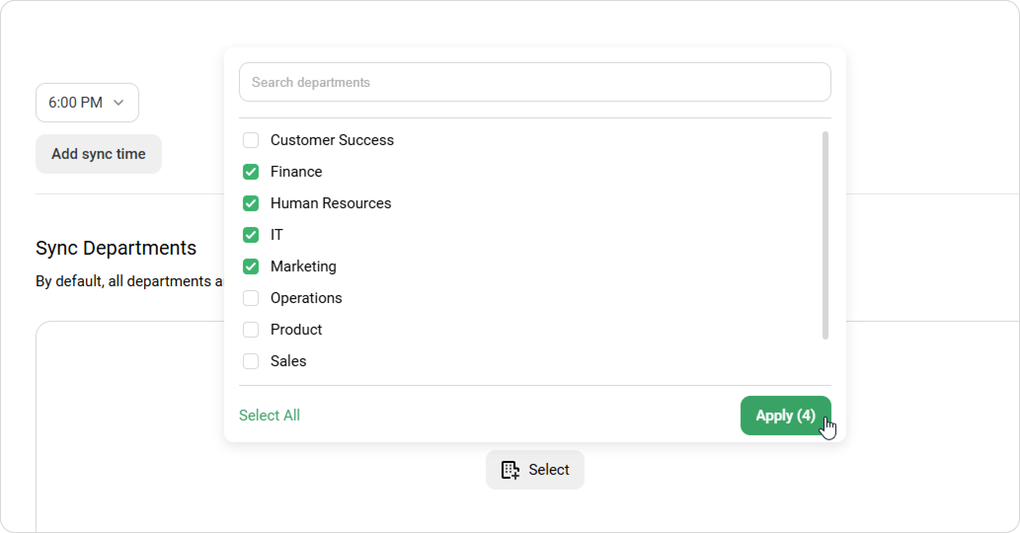 - You can select which departments will be synchronized. Click Select, checkmark the departments, and click Apply.