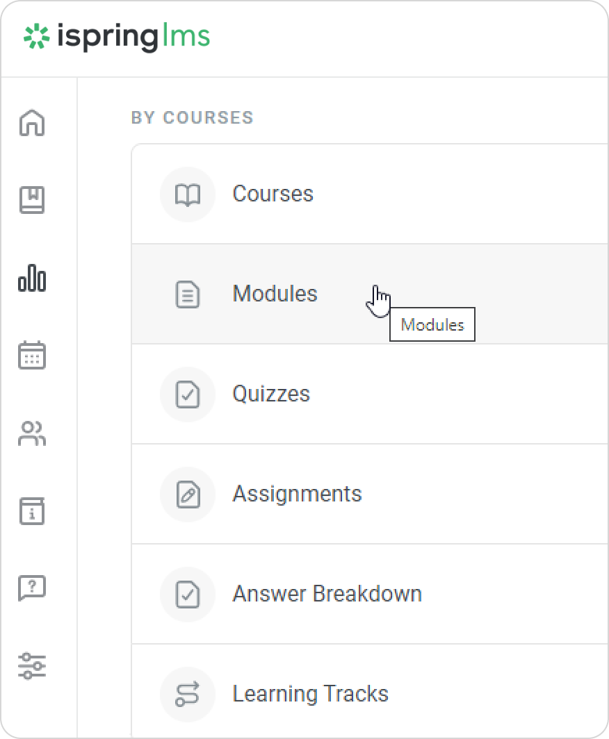 The report contains only modules included in courses. Quizzes, dialog simulations, interactions, videos inserted in iSpring Suite-created presentations as well as standalone modules aren't available in the report.