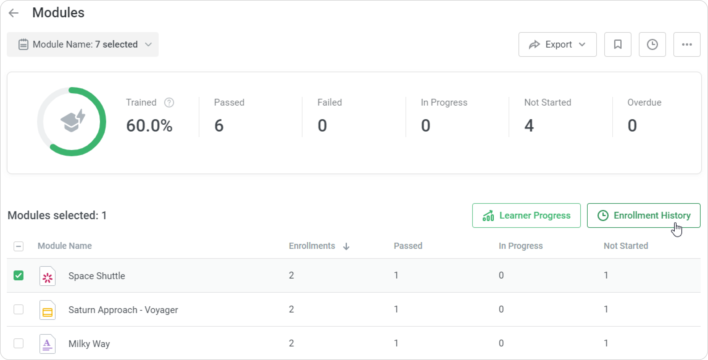 Next, in the Modules report, select a module and click the Enrollment History button.