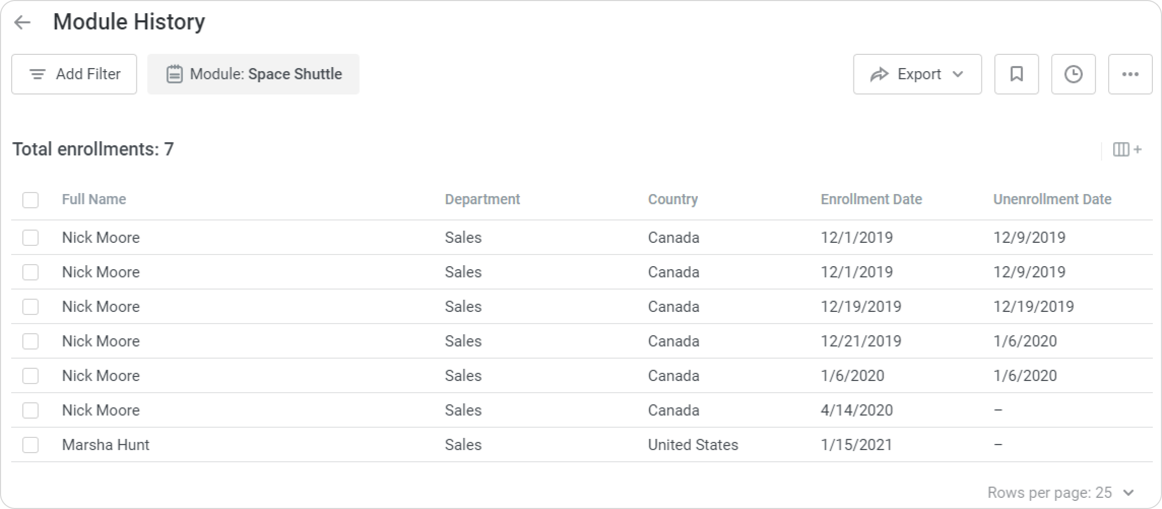 iSpring LMS maintains a history of all enrollments, including those that were canceled. No matter how many times the module was reassigned to a user, the Module History and Learner's Module History reports record each time that it is taken.
