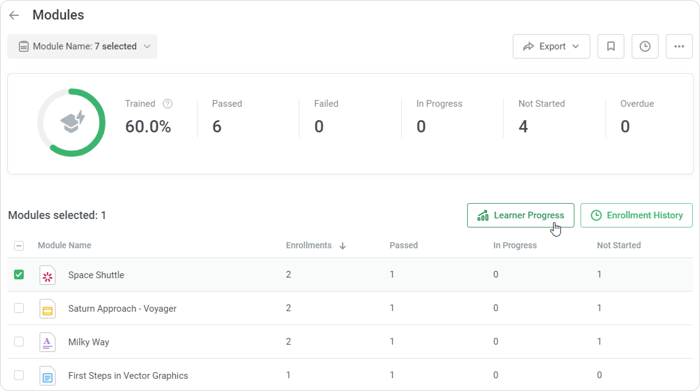 Next, in the Modules report, select a module and click the Learner Progress button.