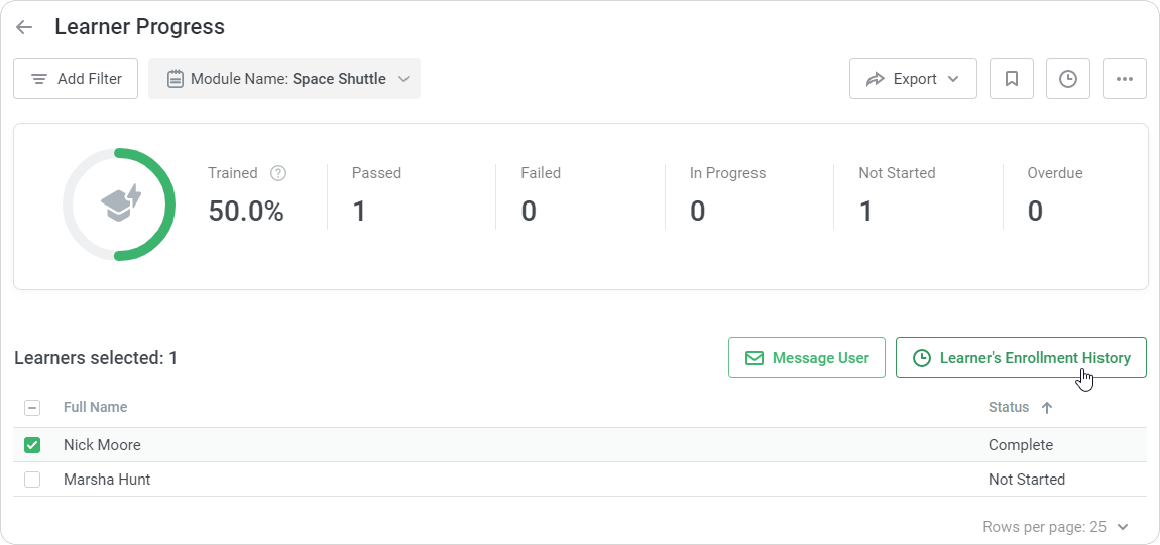 In the Learner Progress in Modules report, click the Learner's Enrollment History button to see all the modules that have been assigned to the user.