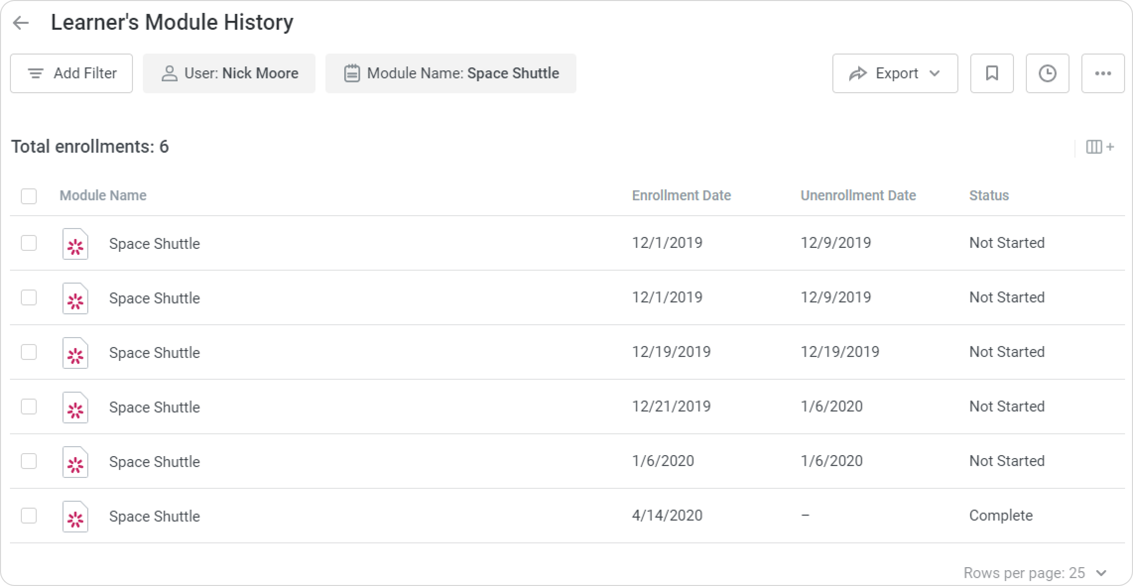 The Learner's Module History report on a particular user will open up. It will show all module enrollments related to the chosen learner.