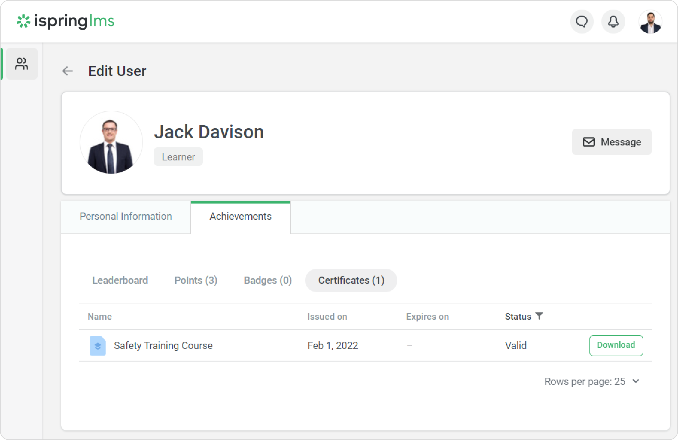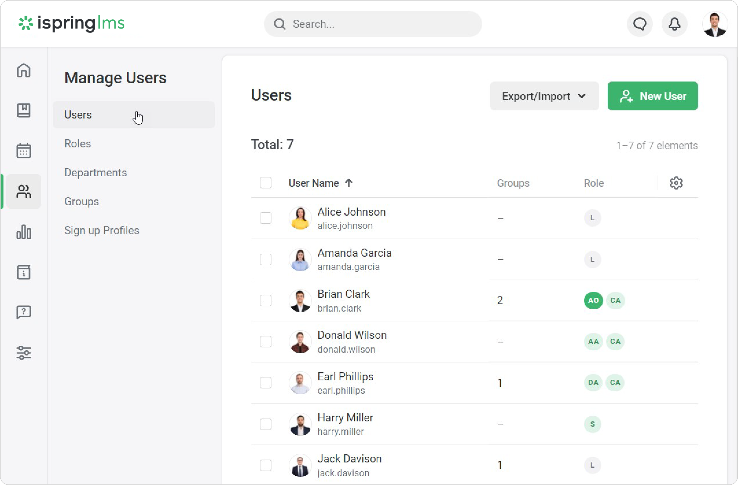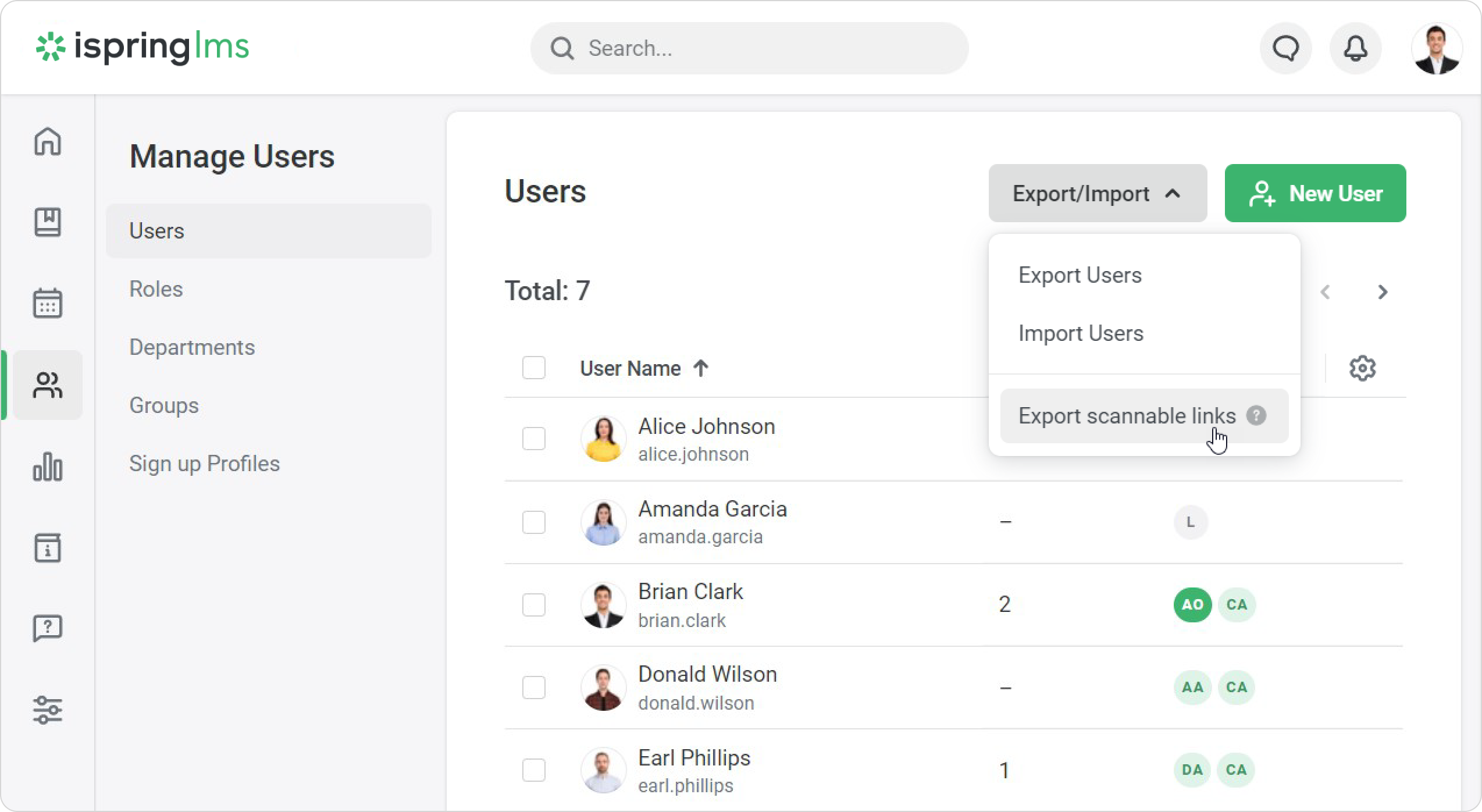 iSpring LMS allows you to export a list of QR codes that link to user profiles. By scanning a code, you will get to the page with the list of user's certificates. These scannable links are convenient to use when you need to quickly check whether an employee has completed the required training.