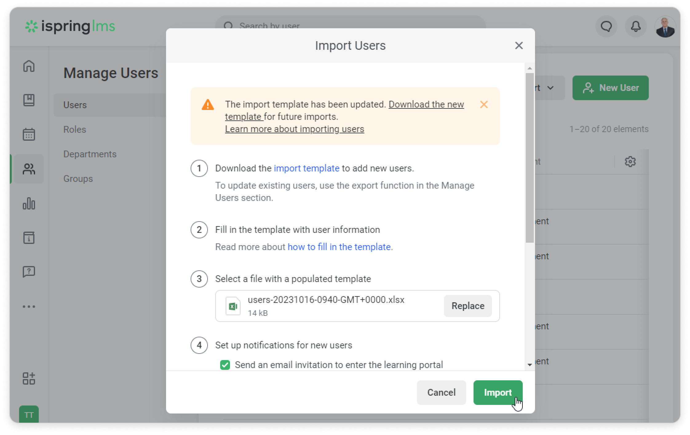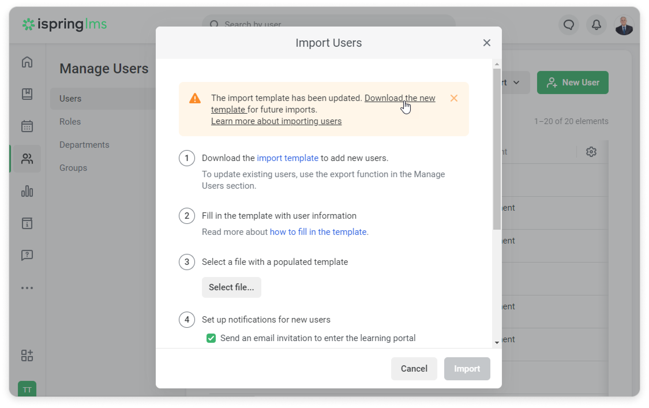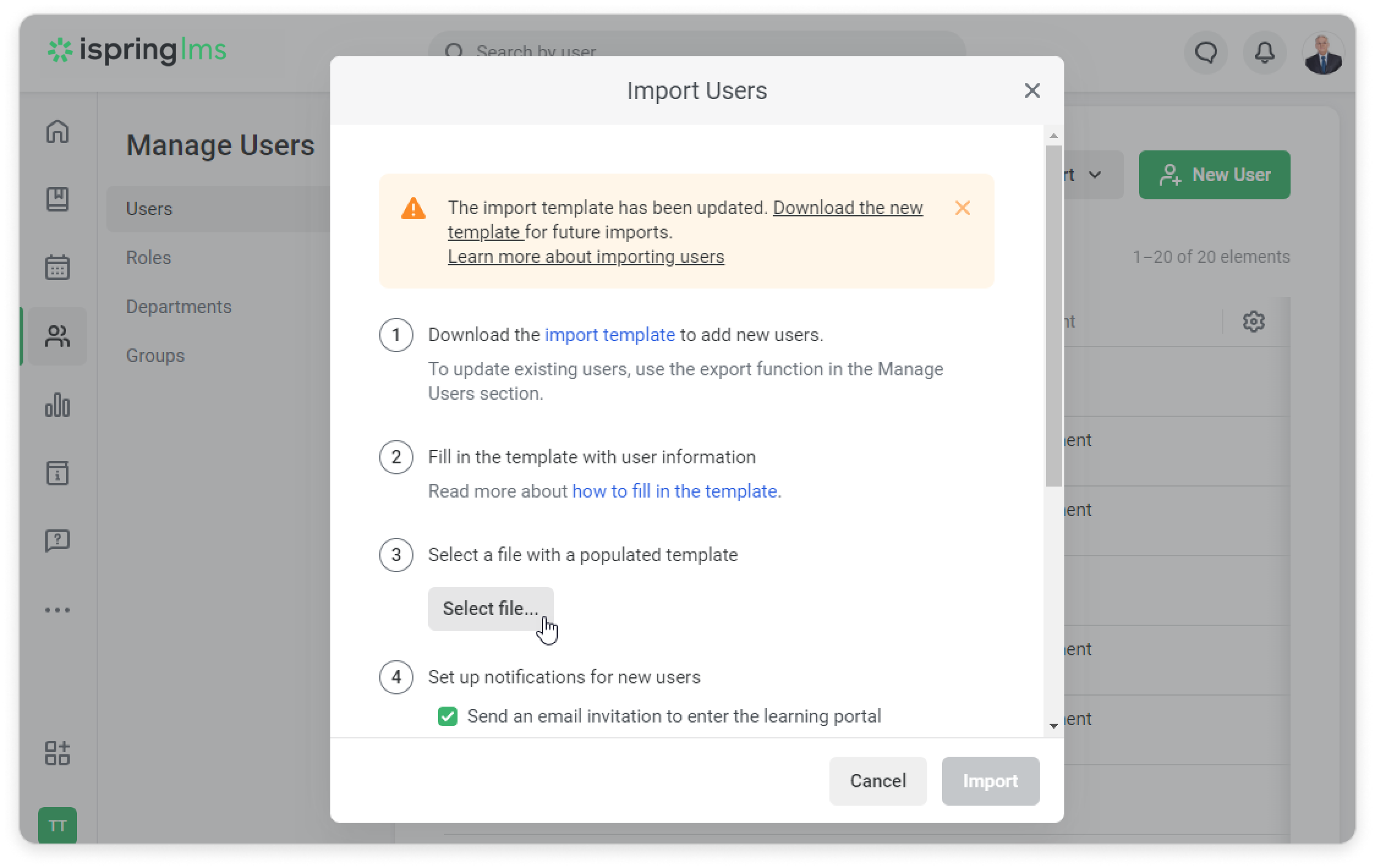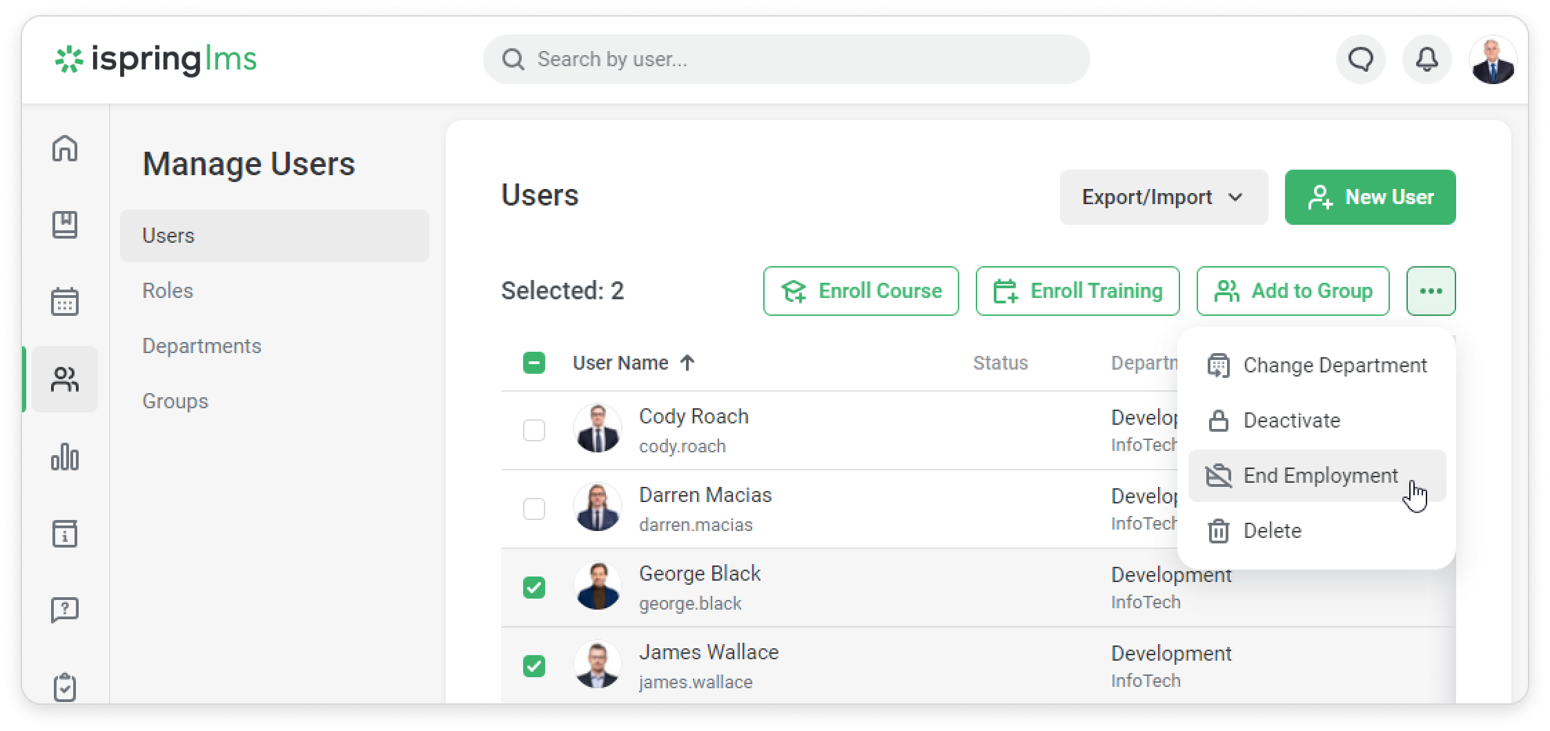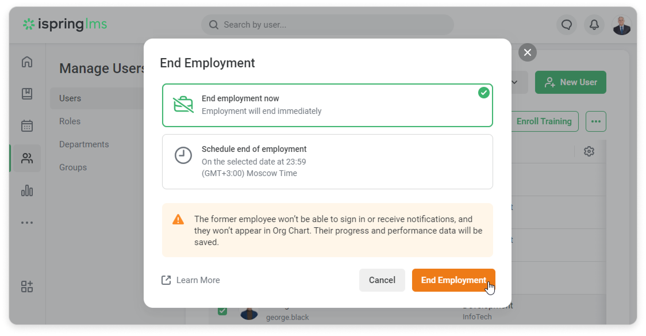 - When you change the user status to "Employment Ended," iSpring LMS will inform you what will happen after that. You can also click on Learn More to go to the help docs.