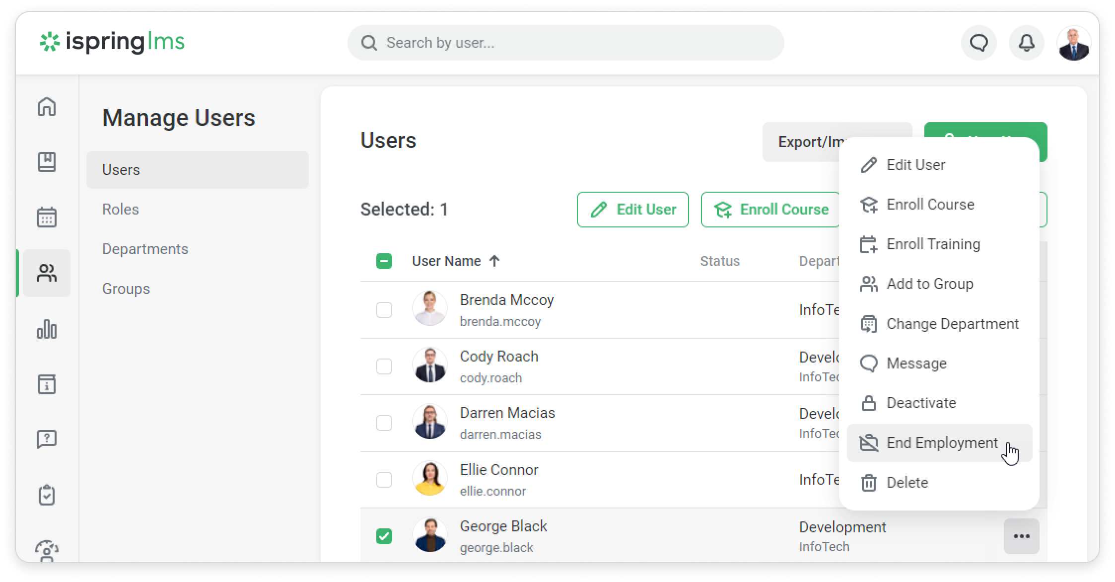 But they cannot be enrolled in courses and training programs. These users can't sign in to their user portal, and they don't get any notifications. If a user is signed in to their portal on the day when their employment ends, iSpring LMS will block their access immediately.