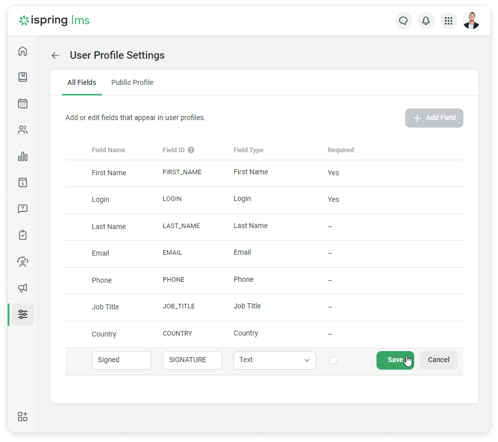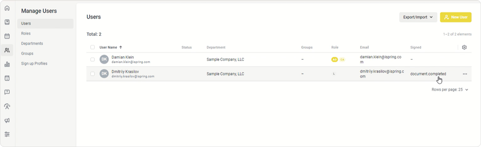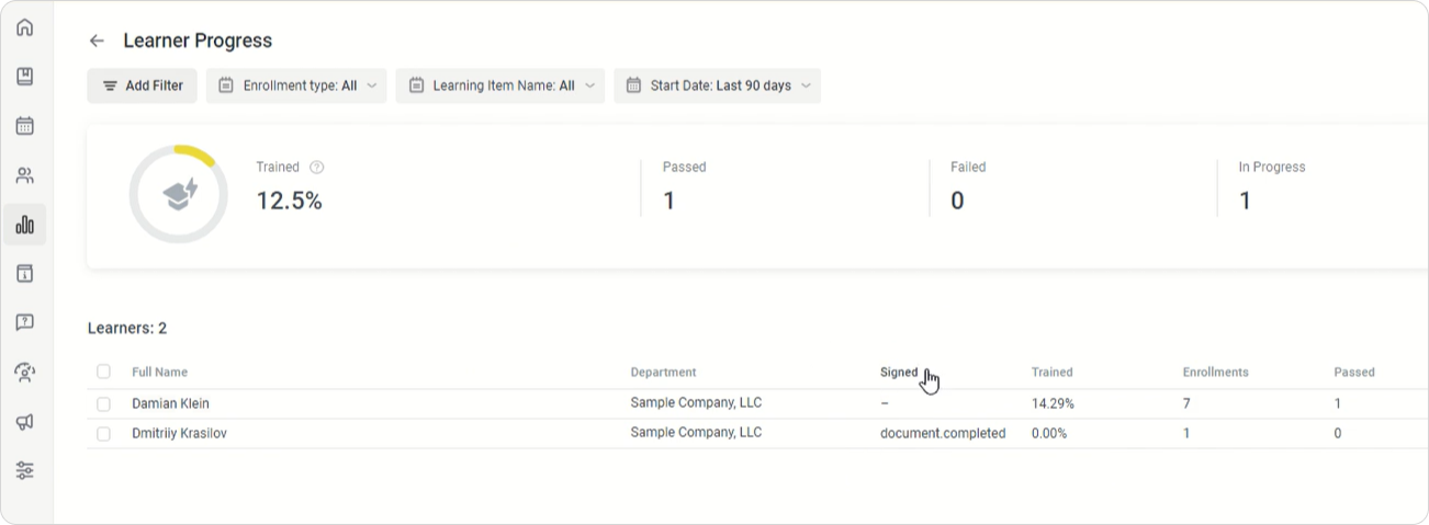Administrators can also go to Reports → Learner Progress in iSpring LMS, select a learning content item and see its status in the Signed column.