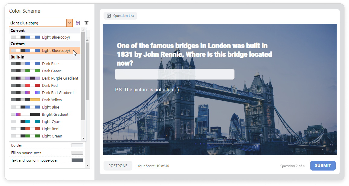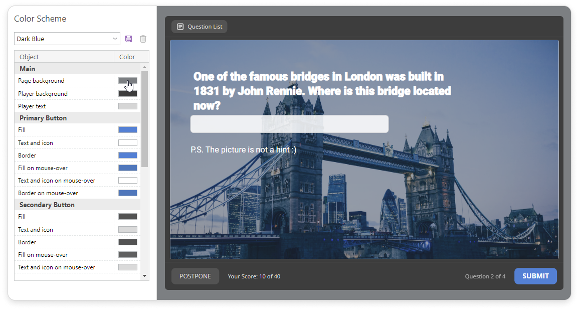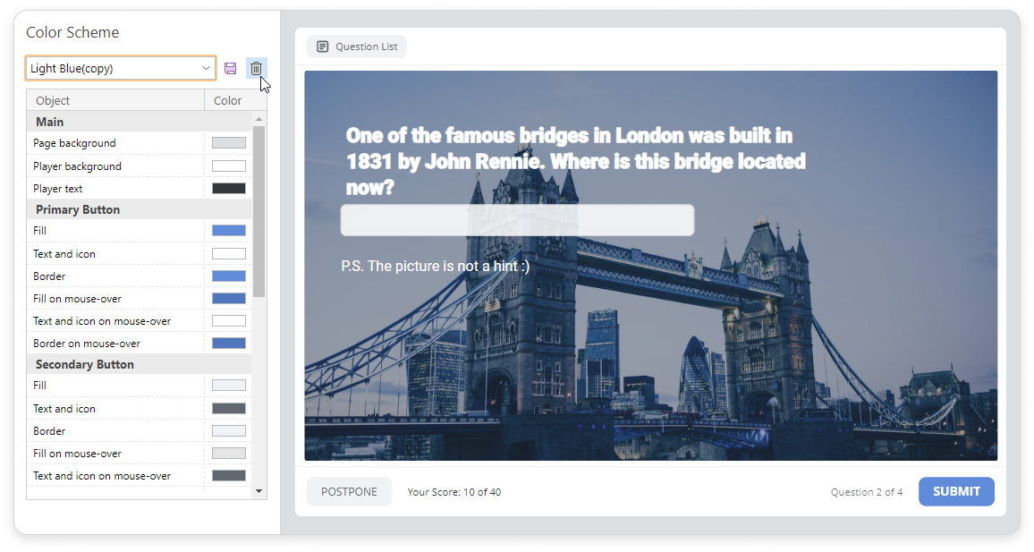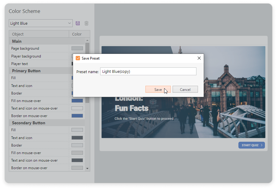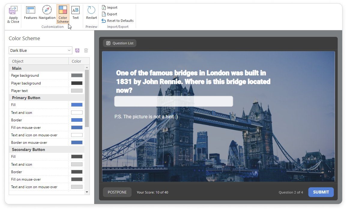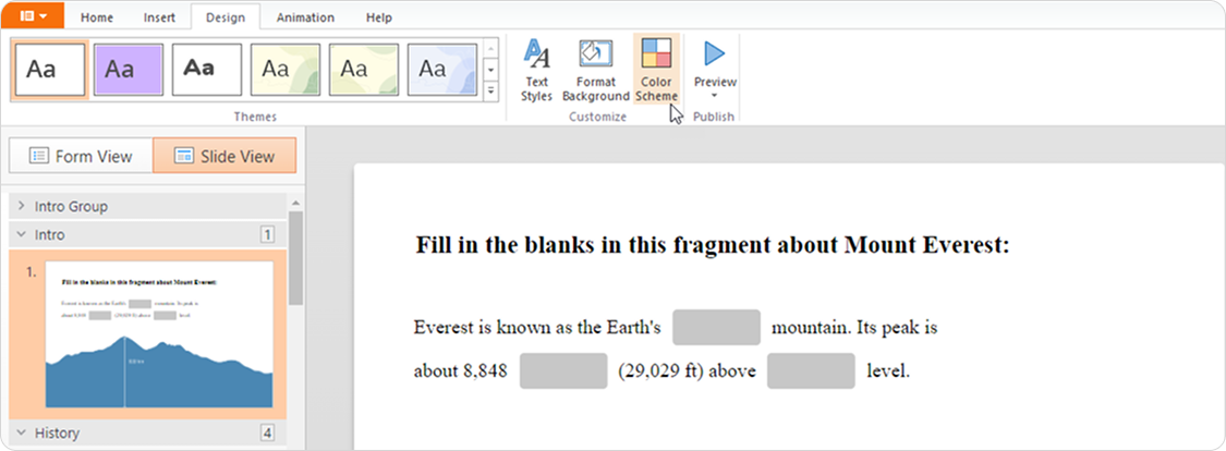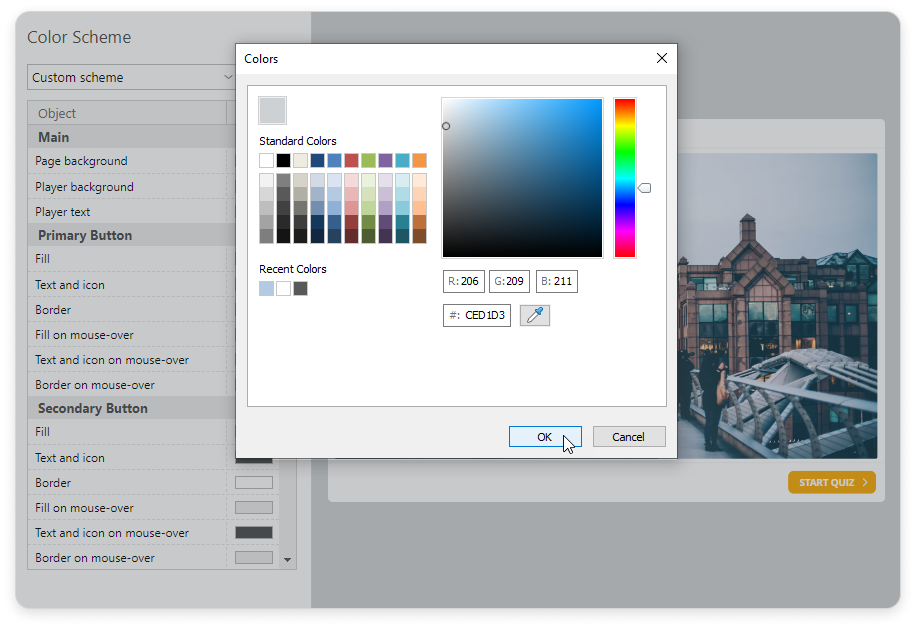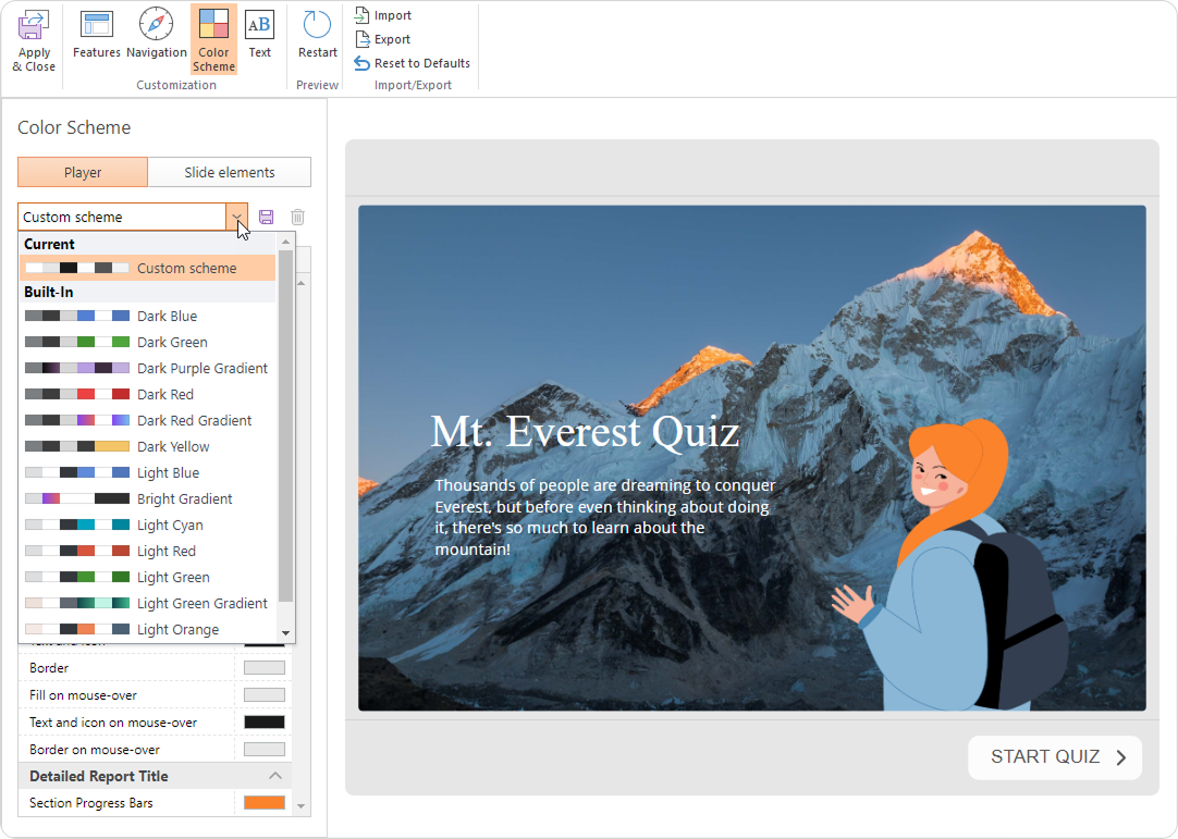 If you have enabled the Display slides on smartphones in mobile-friendly mode in the Navigation section, changes in the player color scheme won't be applied to the slides displayed on a smartphone.