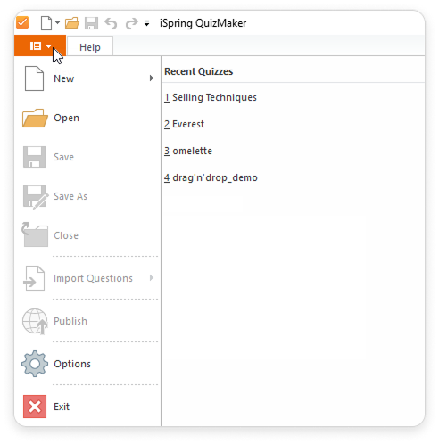 - Click the QuizMaker button in the upper left corner of the toolbar to open the Application Menu.