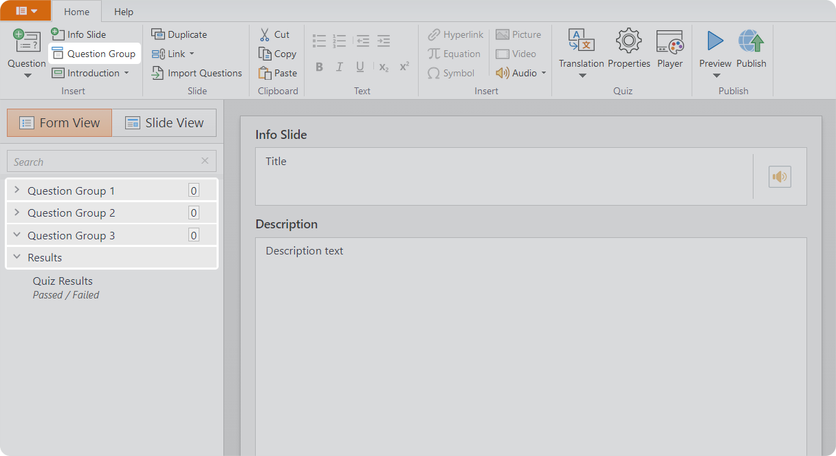 - In the Form View mode, click on Question Group and add three groups.