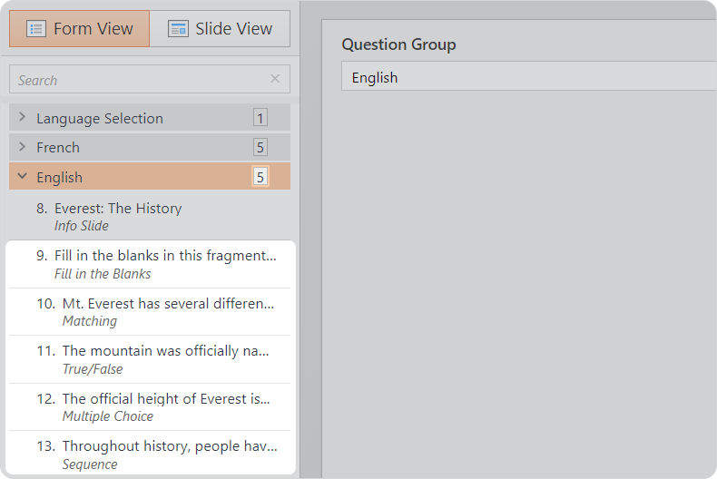 - Rename the question groups. For example: "Language Selection," "French," "English."