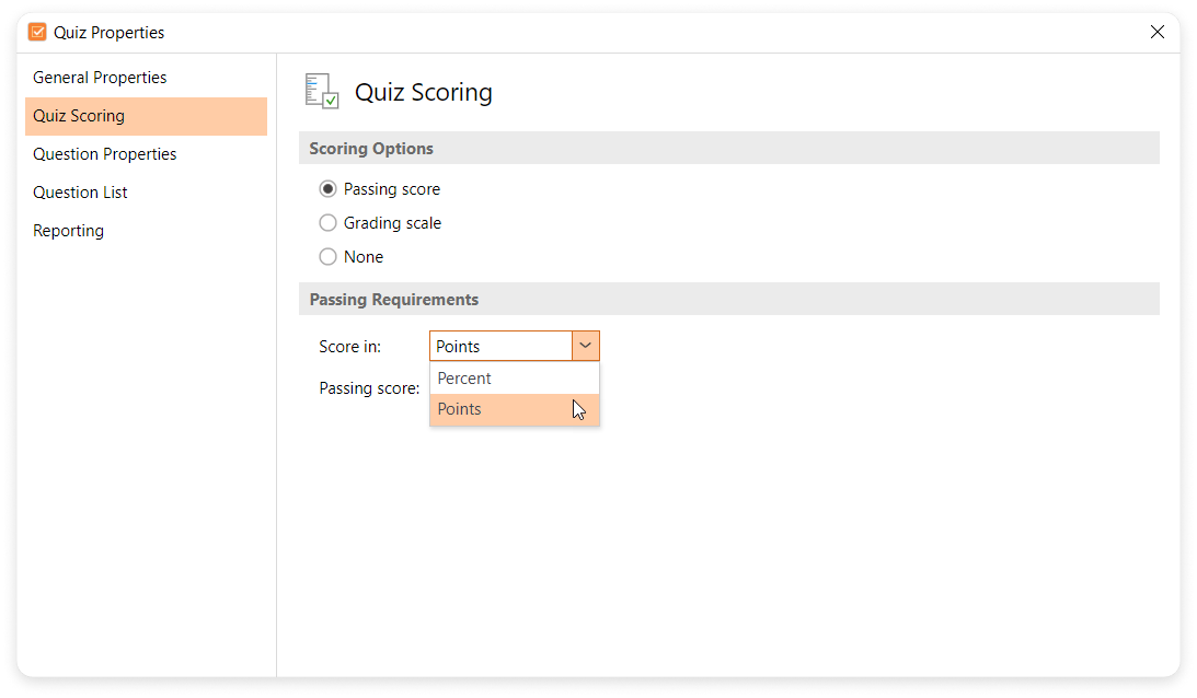 Go to the Quiz Scoring tab. Select Score in > Points.