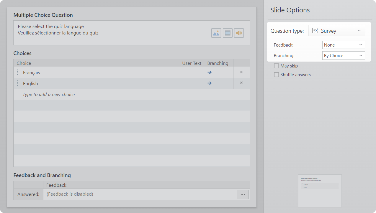 - On the Slide Options sidebar, select Question Type > Survey, Feedback > None, and Branching > By Choice.