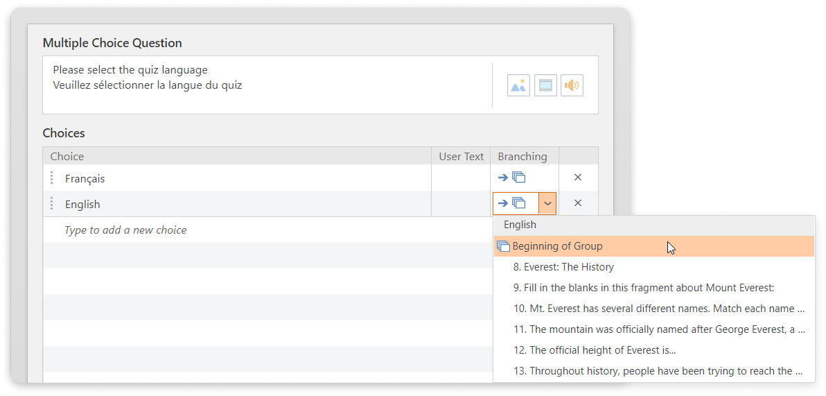 - In the question text field, ask the learner to choose a language.