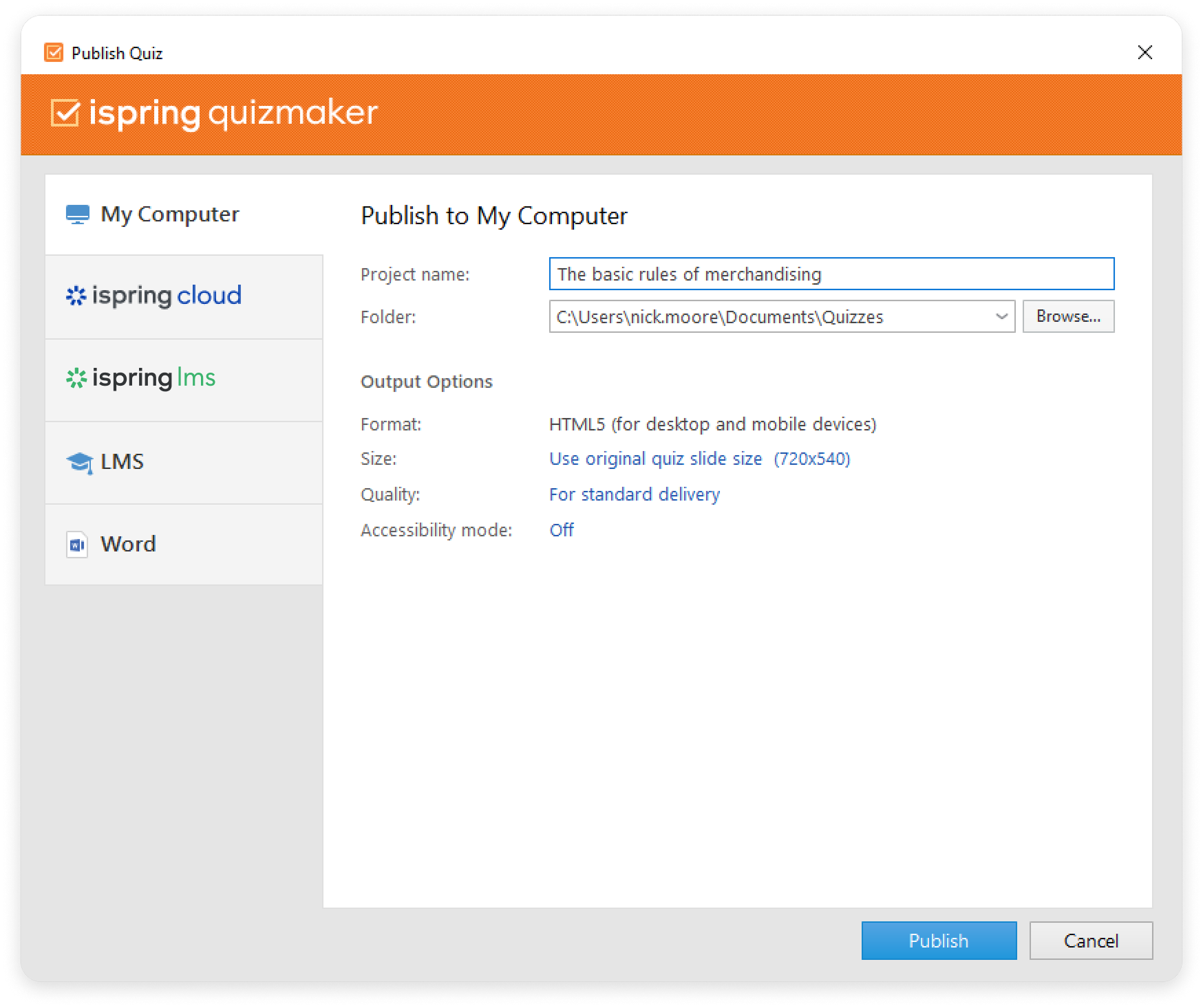 iSpring QuizMaker Publishing Quizzes Current: Publishing Destinations Publishing Destinations Select a publishing destination for your quiz. Note:Publishing to iSpring Cloud is available only if you purchased the iSpring Suite AI package. ×