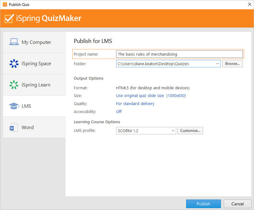 With the LMS option, you can create a package for uploading to any learning management system.