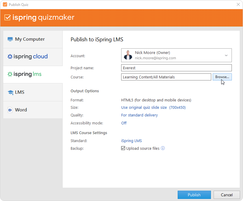 - In the Publish Quiz window, select the iSpring LMS tab. Select the project that has the content you want to replace. To do this, click Browse in the Course field.